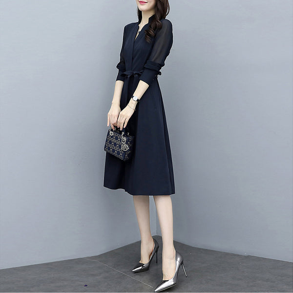 Craft: Collage/Stitching Skirt length: mid-length skirt Skirt type: A-line skirt Collar type: V-neck Sleeve type: conventional sleeve Sleeve length: long sleeve Waist type: elastic waist Clothing placket: hedging Popular elements: stitching, three-dimensional decoration, lace/belt, other Fabric name: Chiffon Main fabric composition: polyester fiber (polyester) The content of the main fabric ingredient: 51%-70%